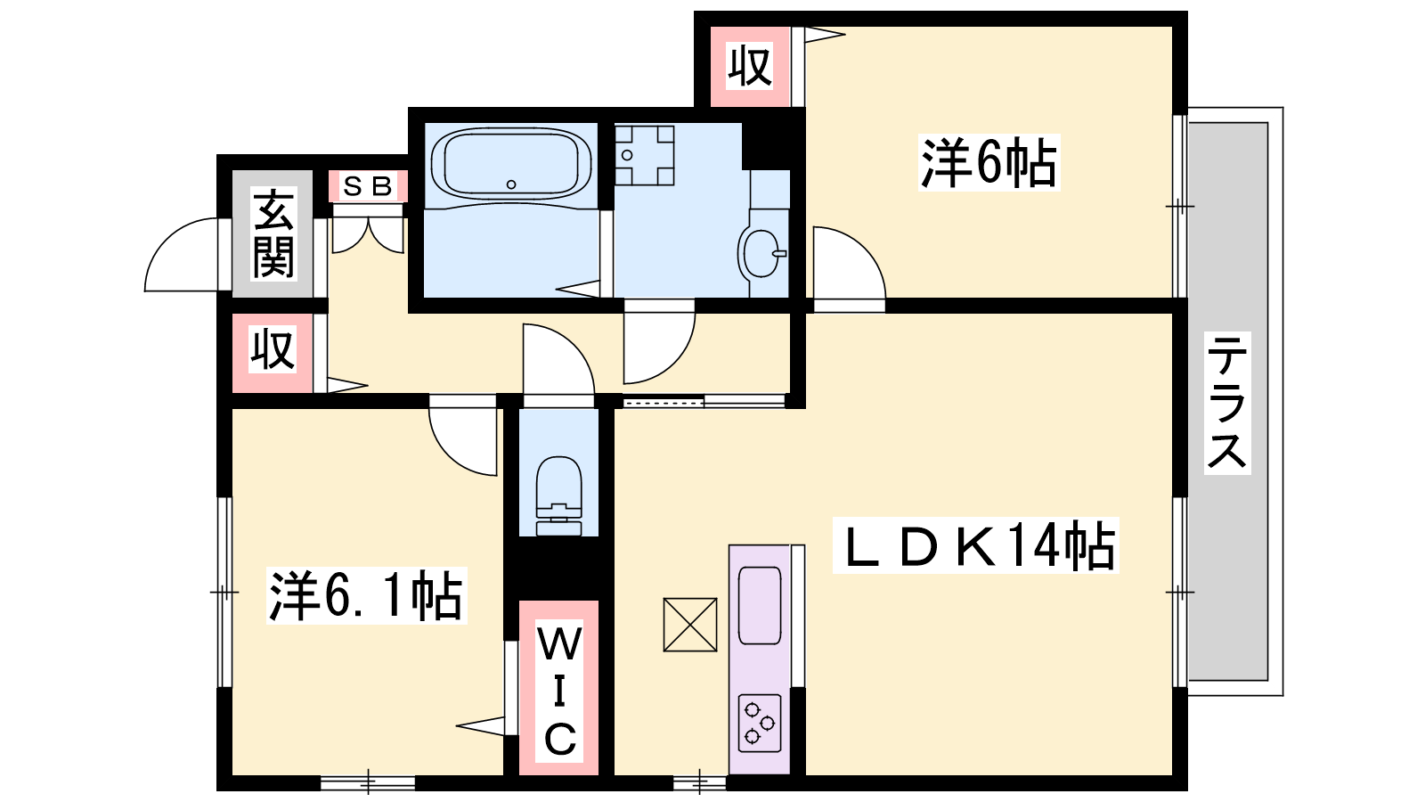 - LDK14帖、洋室6.1帖、洋室6帖