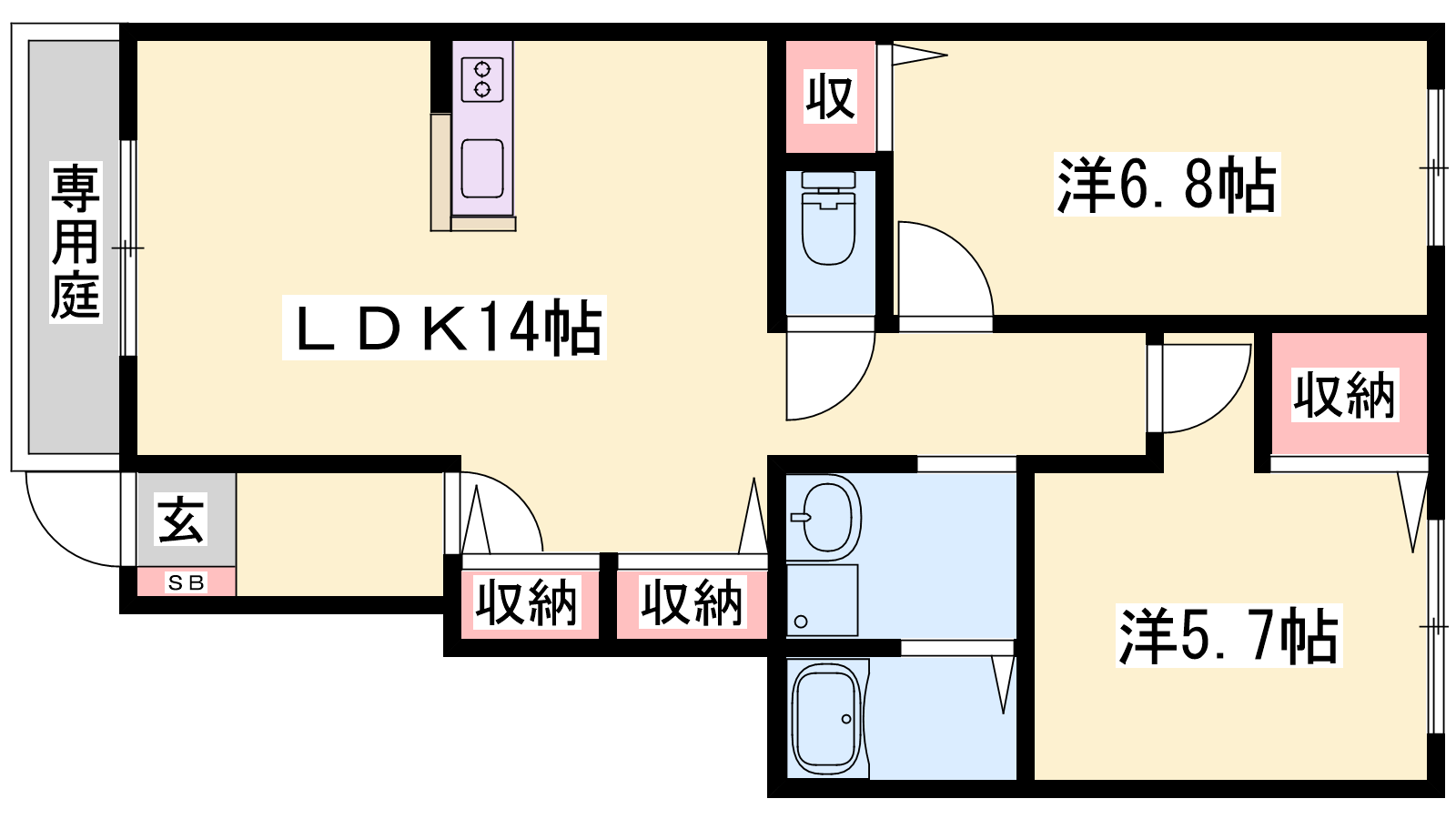 - LDK14帖、洋室6.8帖、洋室5.7帖
