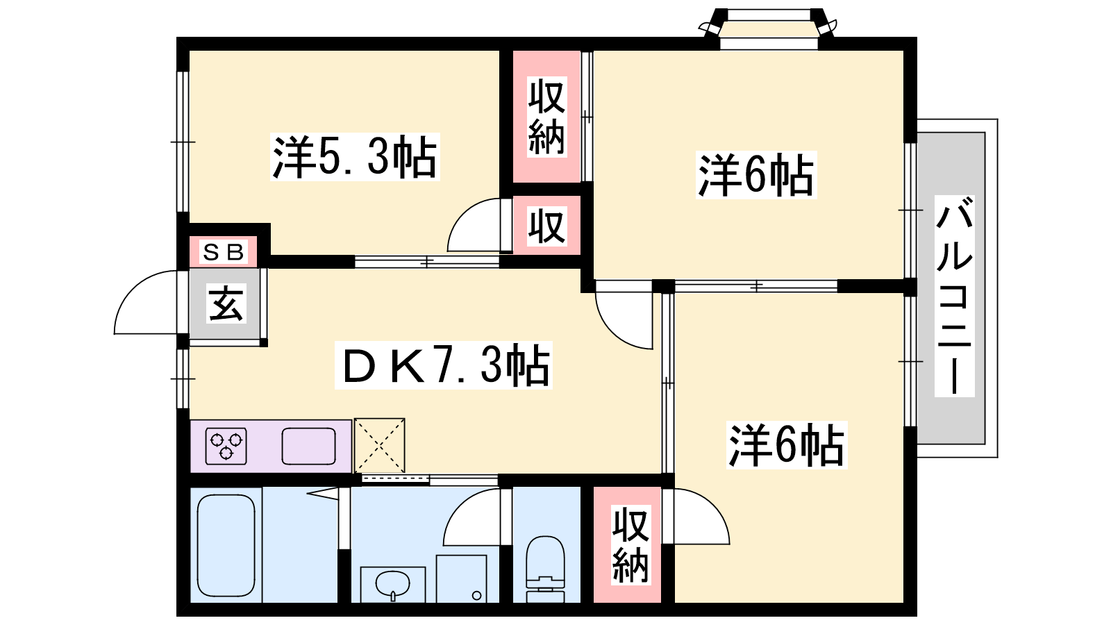 - DK7.3帖、洋室6帖、洋室6帖、洋室5.3帖