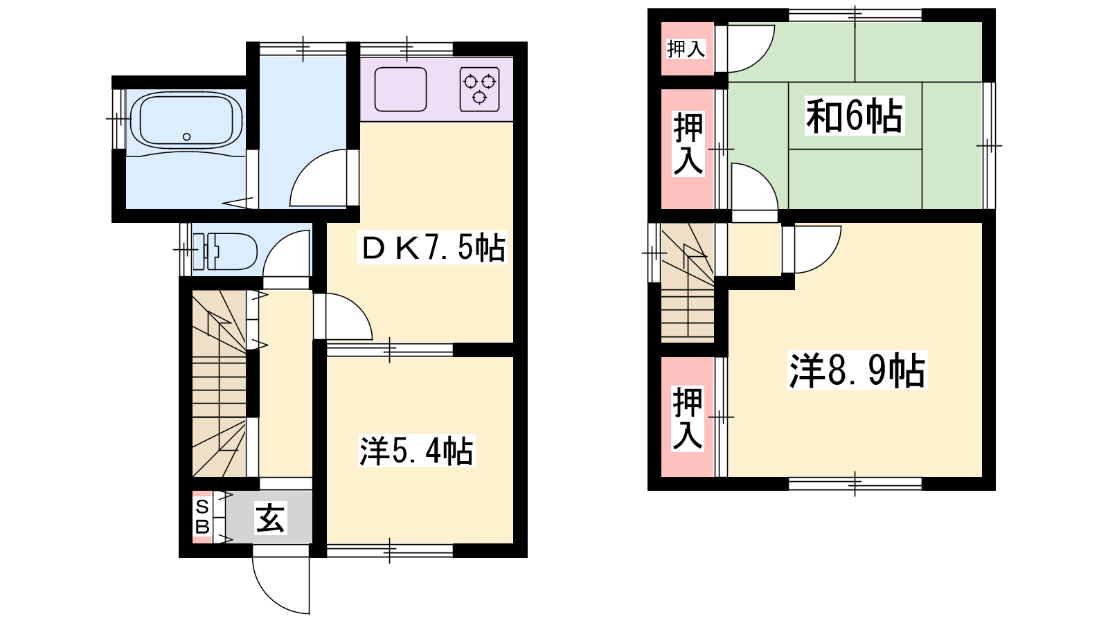 - DK7.5帖、洋室8.9帖、洋室5.4帖、和室6帖
