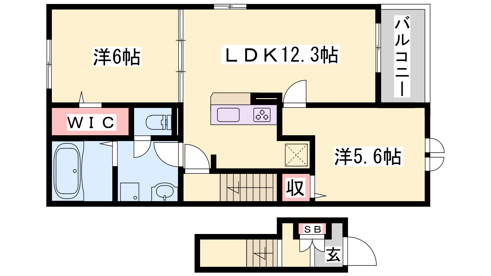 - LDK12.3帖、洋室6帖、洋室5.6帖