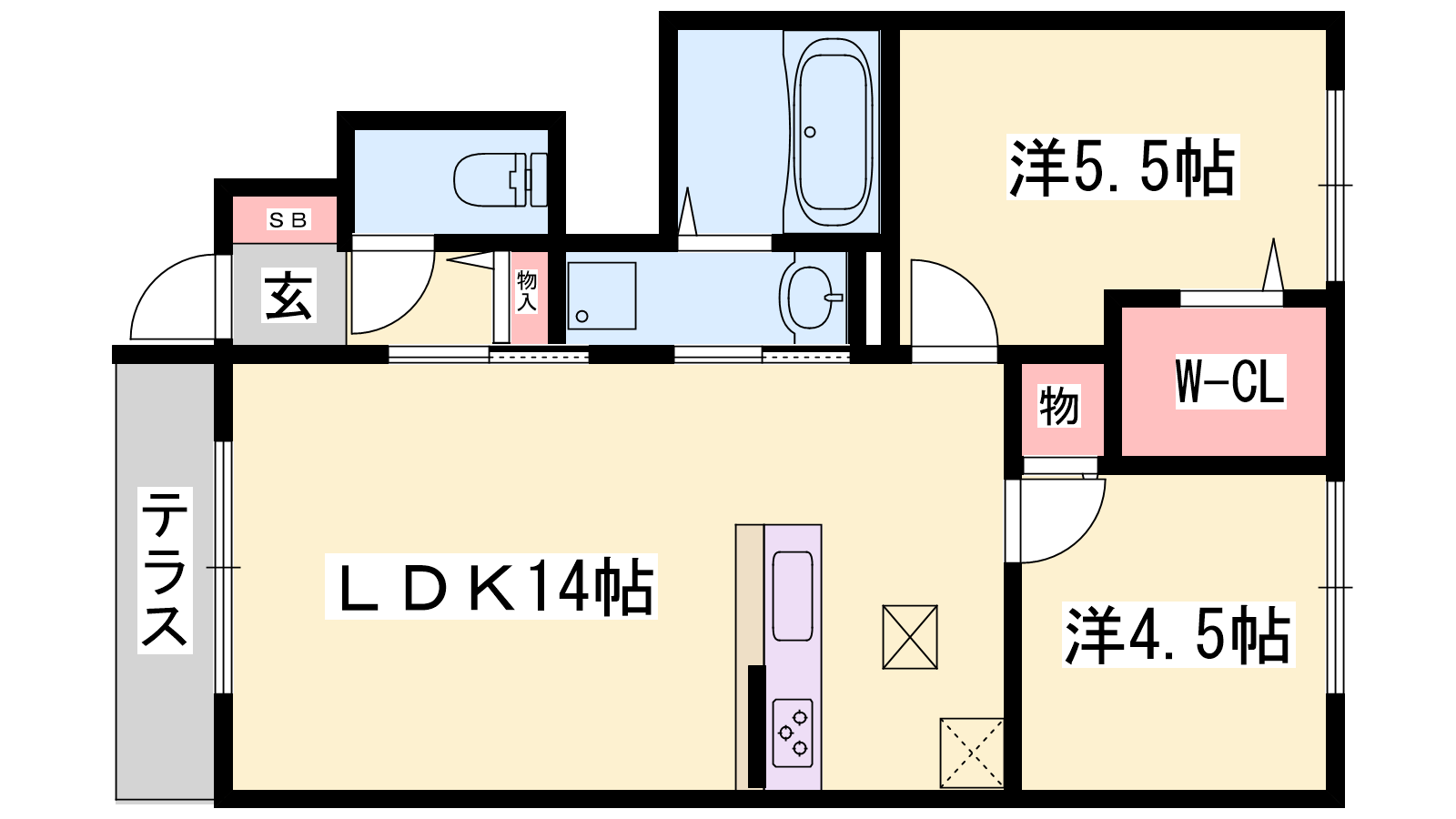 - LDK14帖、洋室5.5帖、洋室4.5帖