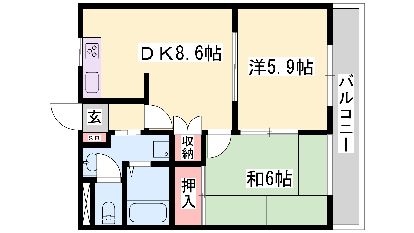 - LDK8.6帖、洋室5.9帖、和室6帖