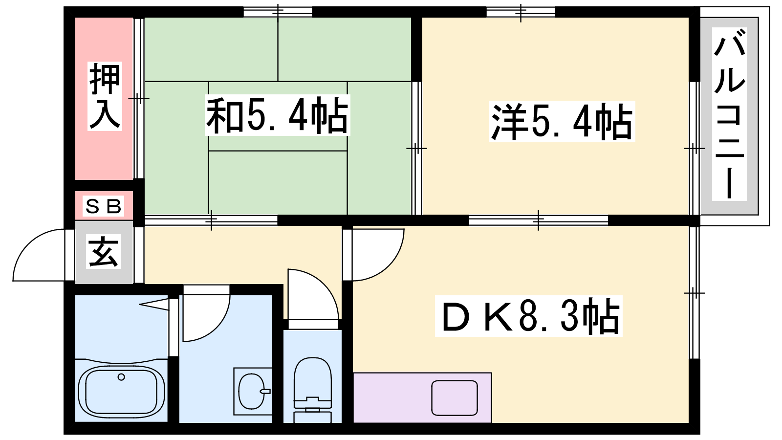 - DK8.3帖、洋室5.4帖、和室5.4帖