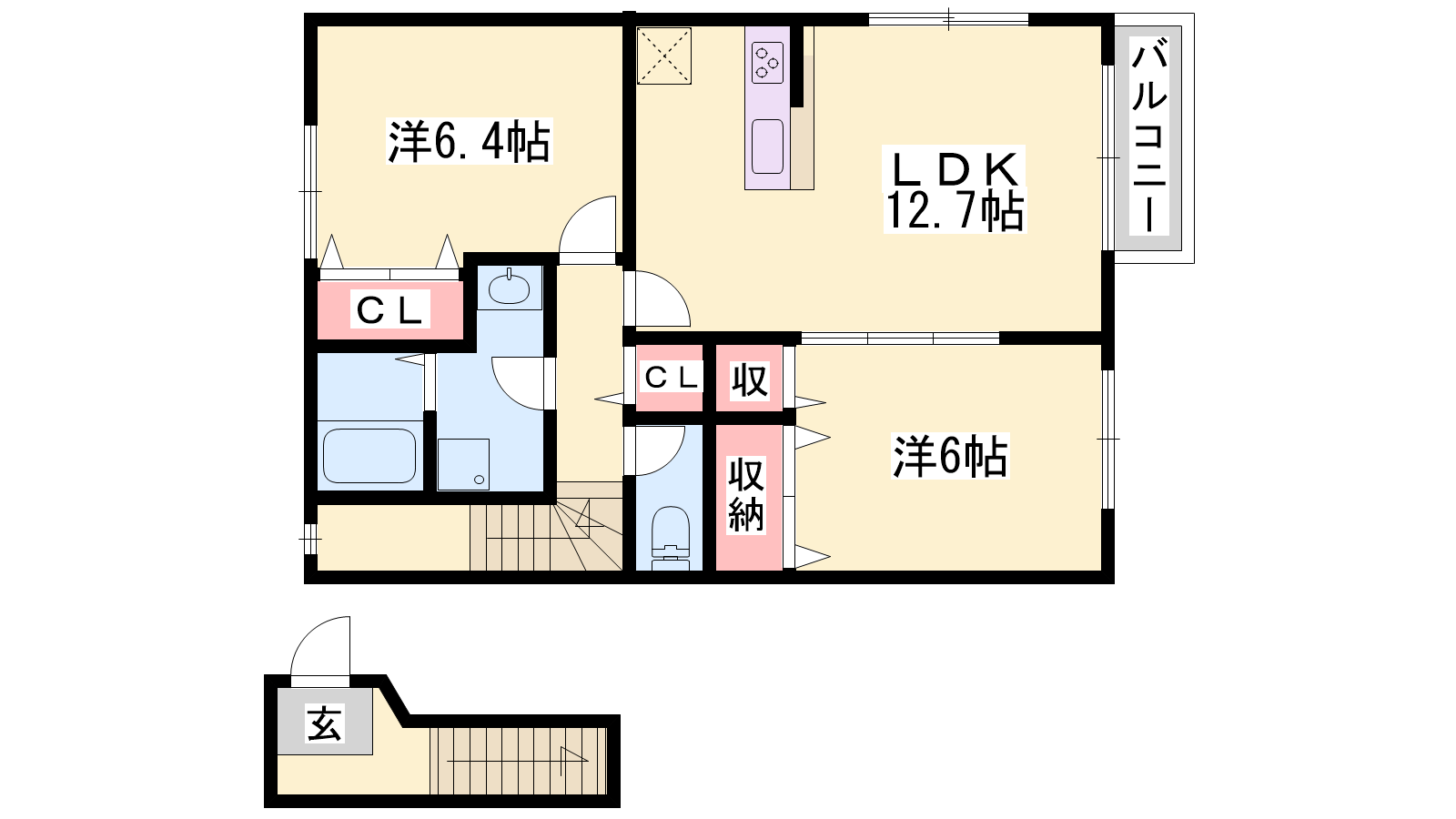 - LDK12.7帖、洋室6.4帖、洋室6帖
