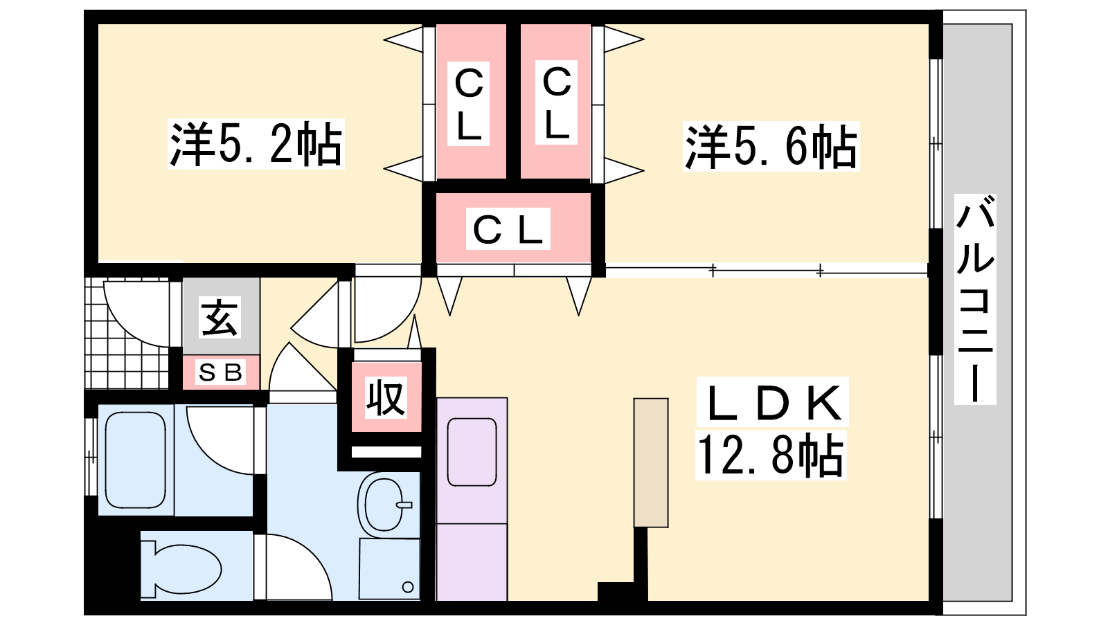 - LDK12.8帖、洋室5.6帖、洋室5.2帖
