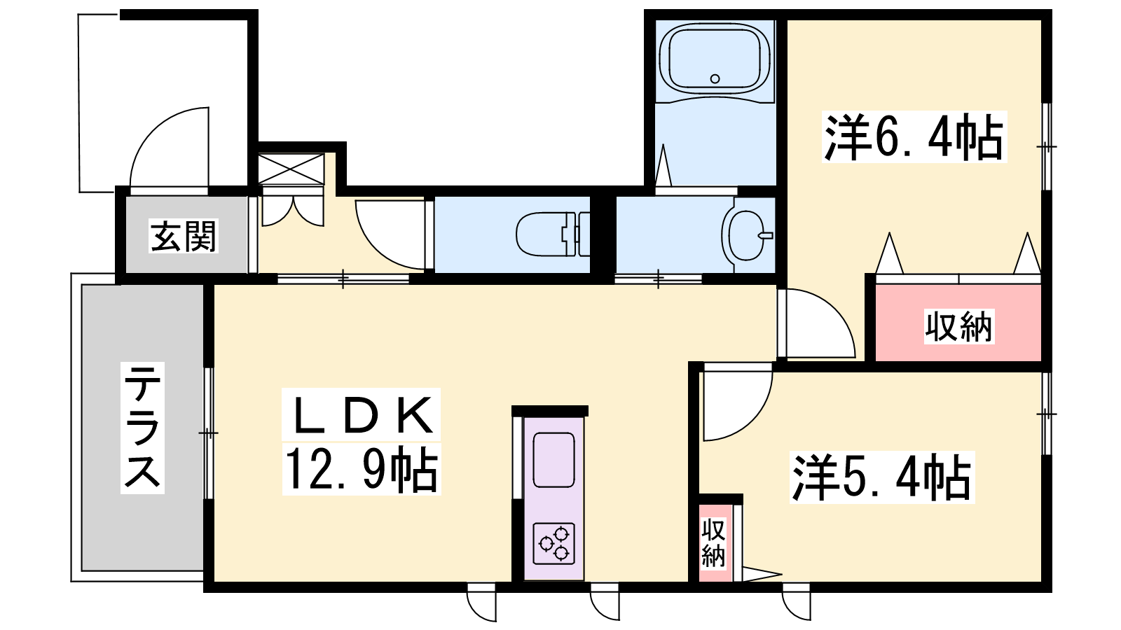 - LDK12.9帖、洋室6.4帖、洋室5.4帖