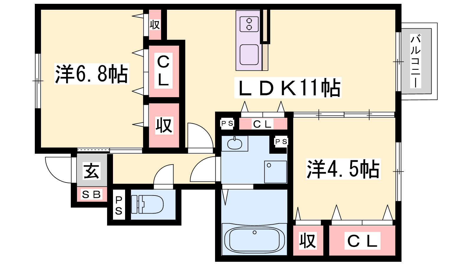 - LDK11帖、洋室6.8帖、洋室4.5帖