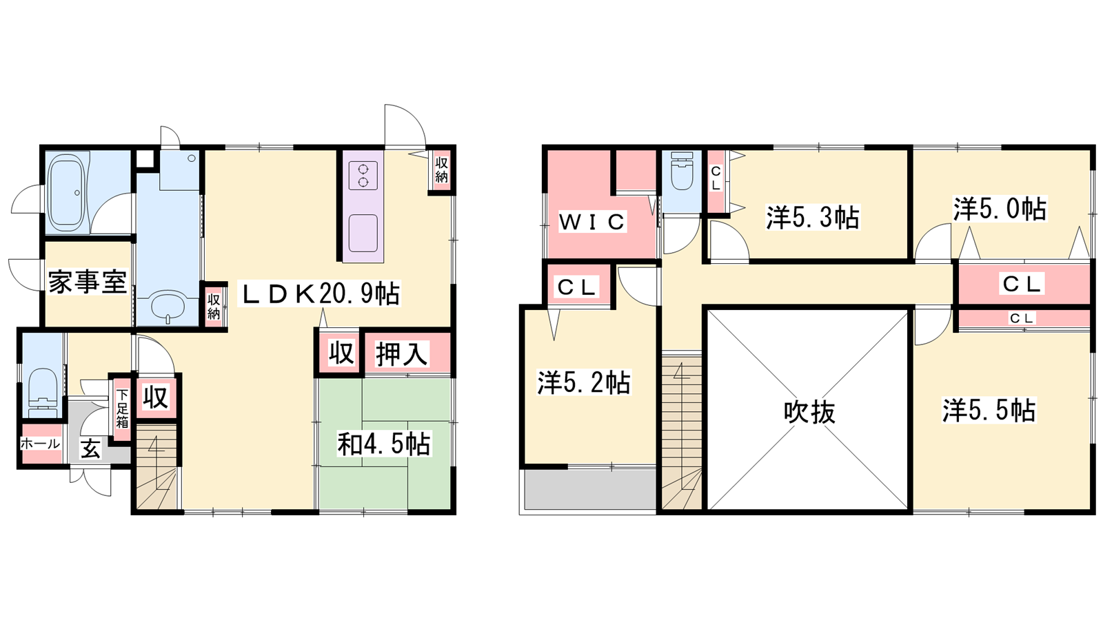 - LDK20.9帖、和室4.5帖、洋室5.3帖、洋室5帖、洋室5.5帖、洋室5.2帖