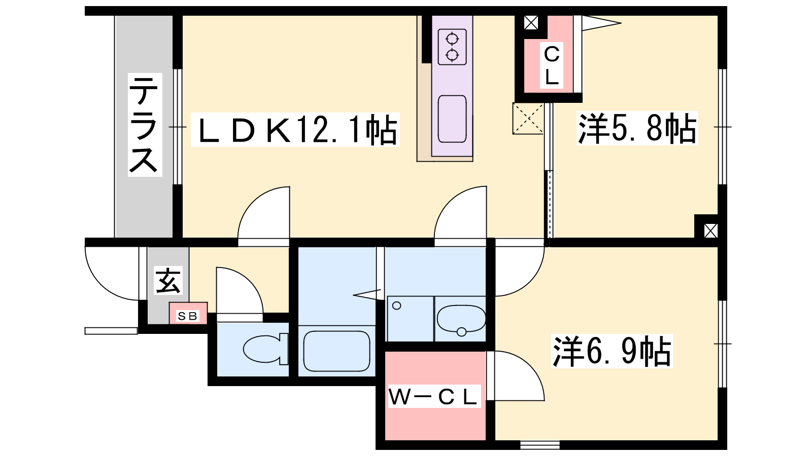 - LDK12.1帖、洋室5.8帖、洋室6.9帖