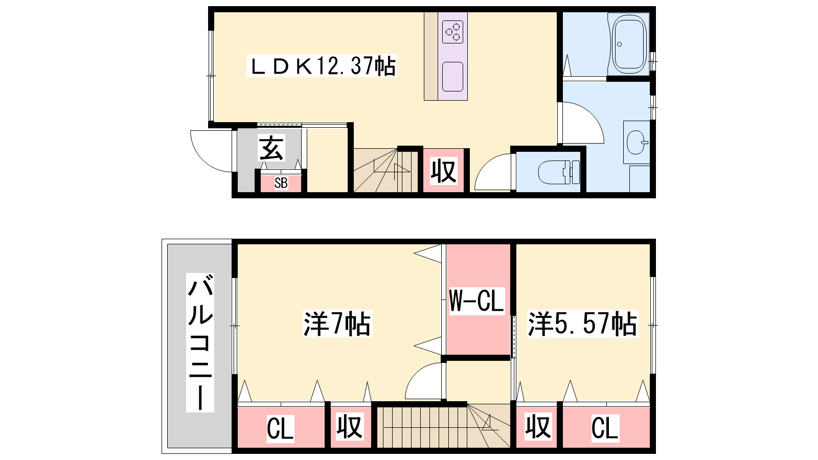 - LDK12.3帖、洋室7帖、洋室5.57帖