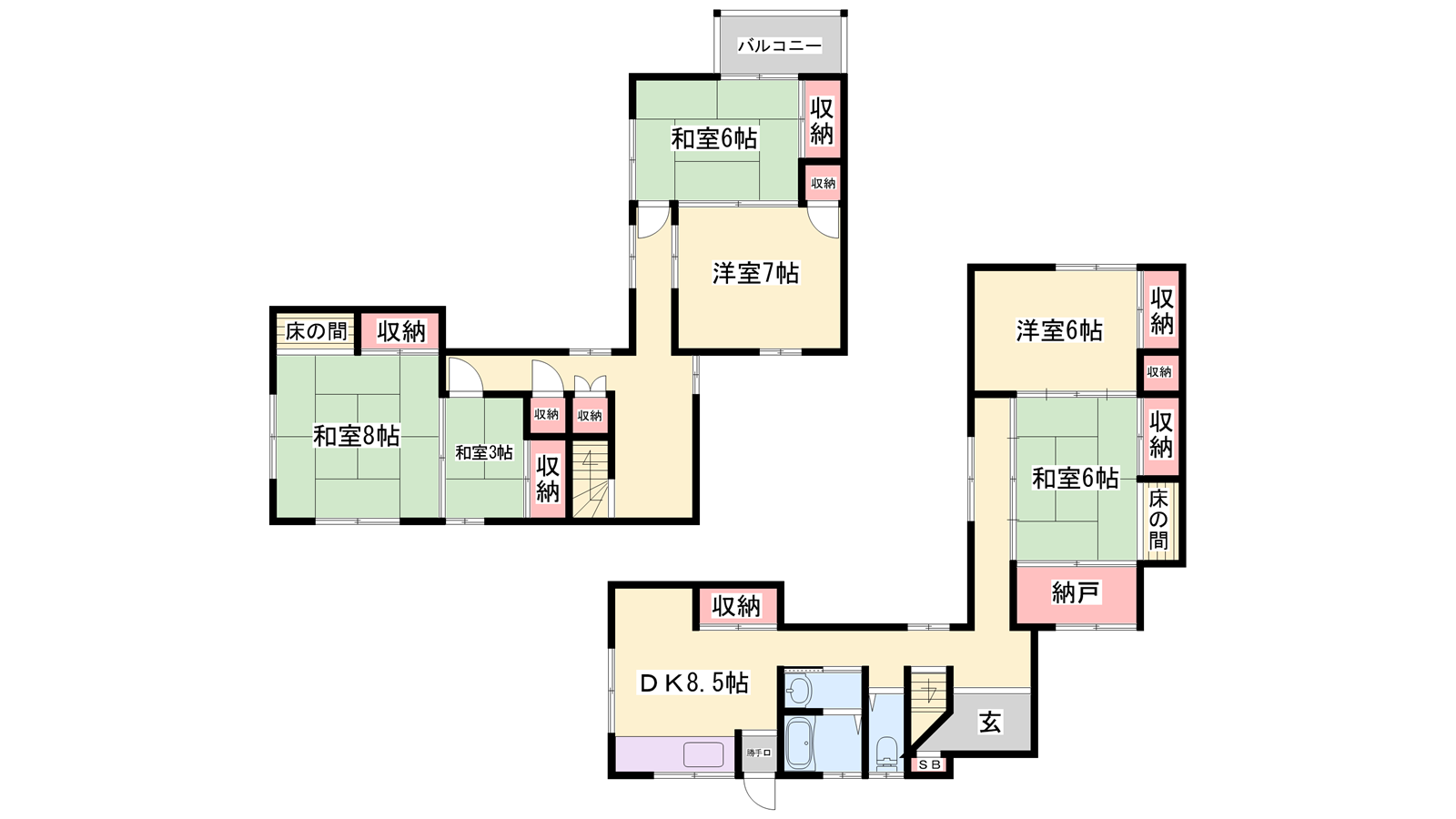 - DK8.5帖、洋室7帖、洋室6帖、和室8帖、和室6帖、和室6帖、和室3帖