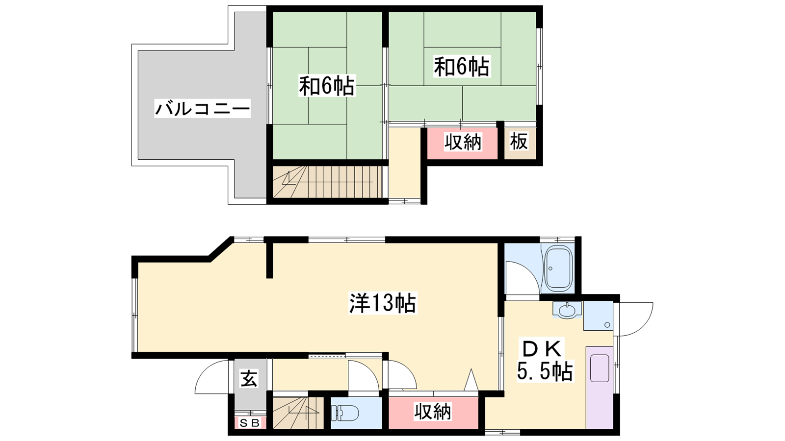 - DK5.5帖、洋室13帖、和室6帖、和室6帖