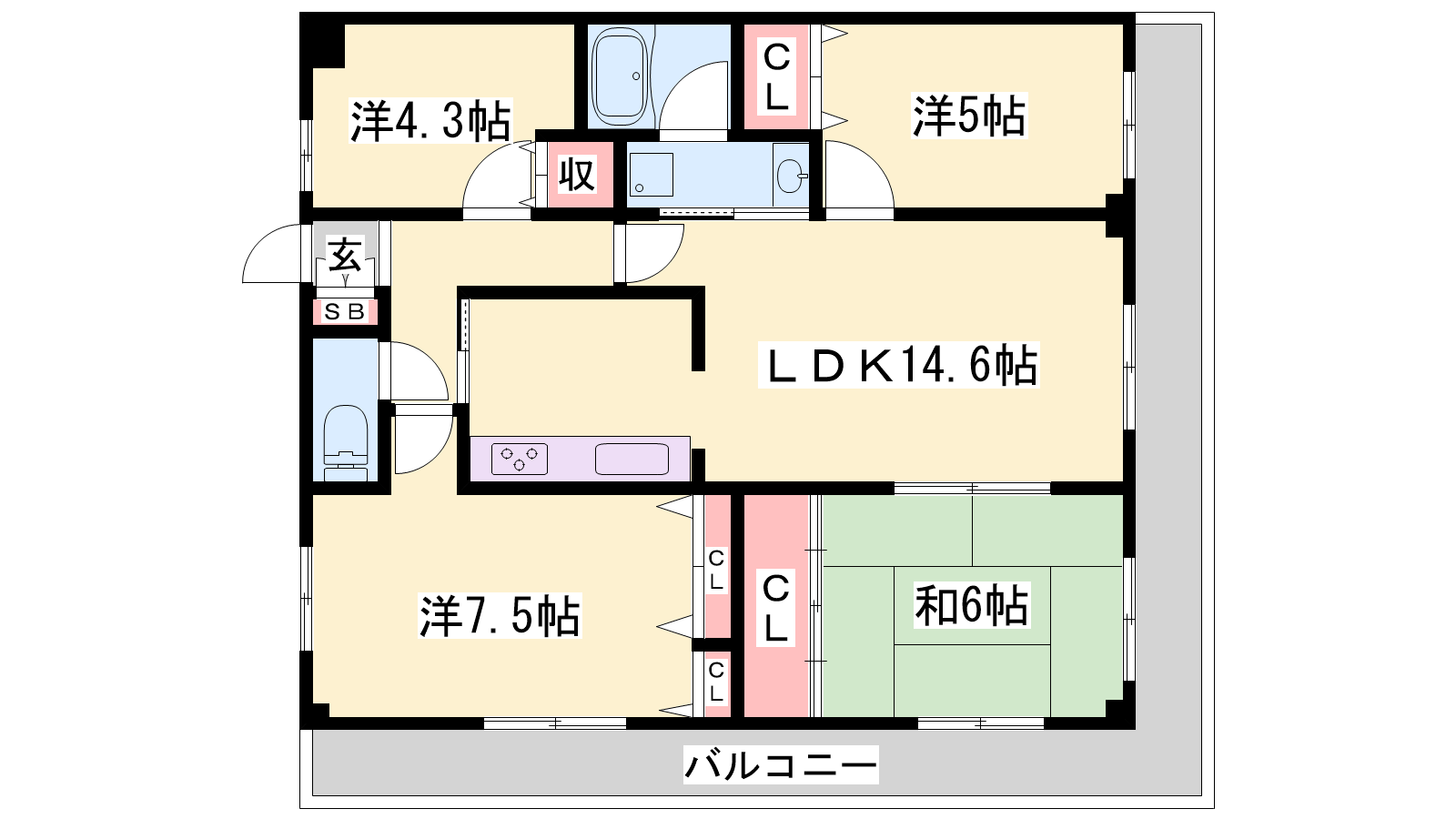 - LDK14.6帖、洋室7.5帖、洋室5帖、洋室4.3帖、和室6帖