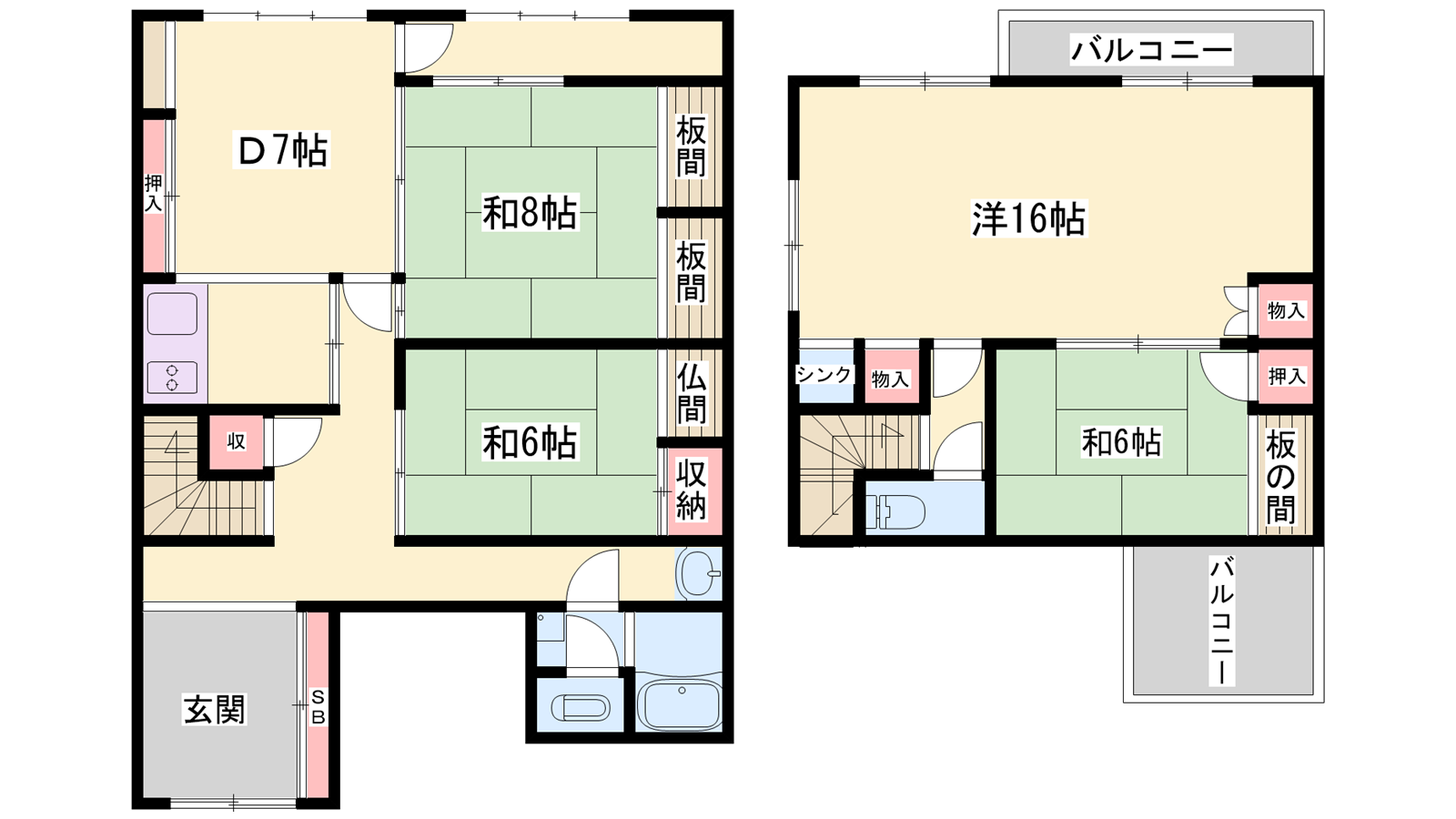 - DK7帖、和室6帖、和室6帖、和室8帖、洋室16帖