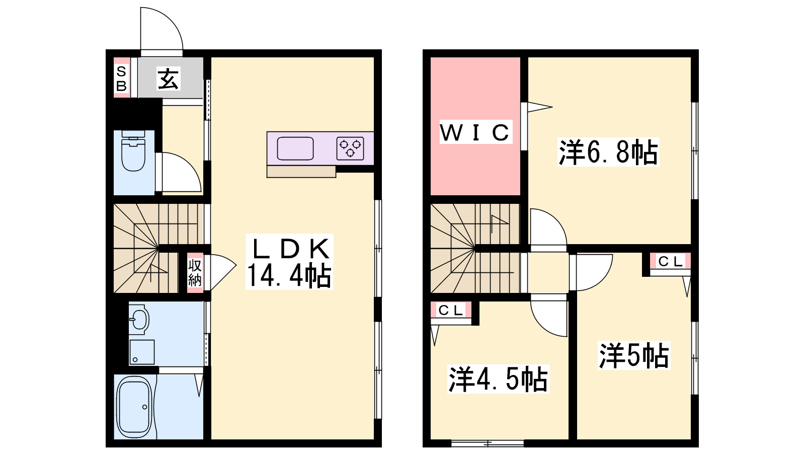 - LDK14.4帖、洋室6.8帖、洋室5帖、洋室4.5帖