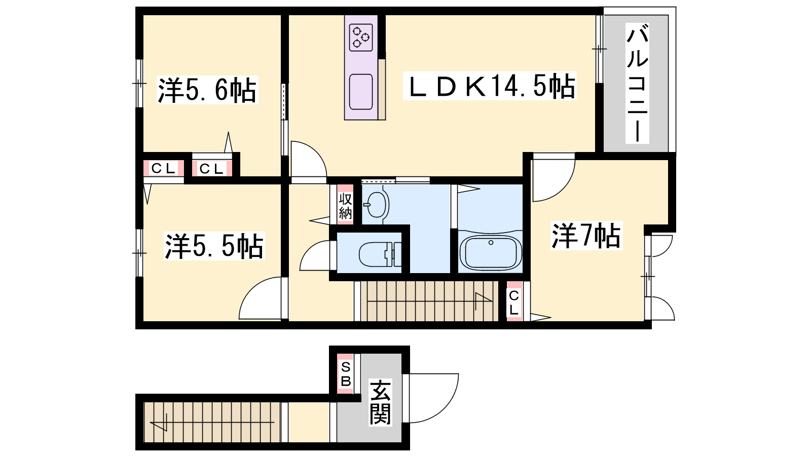 - LDK14.5帖、洋室7帖、洋室5.6帖、洋室5.5帖