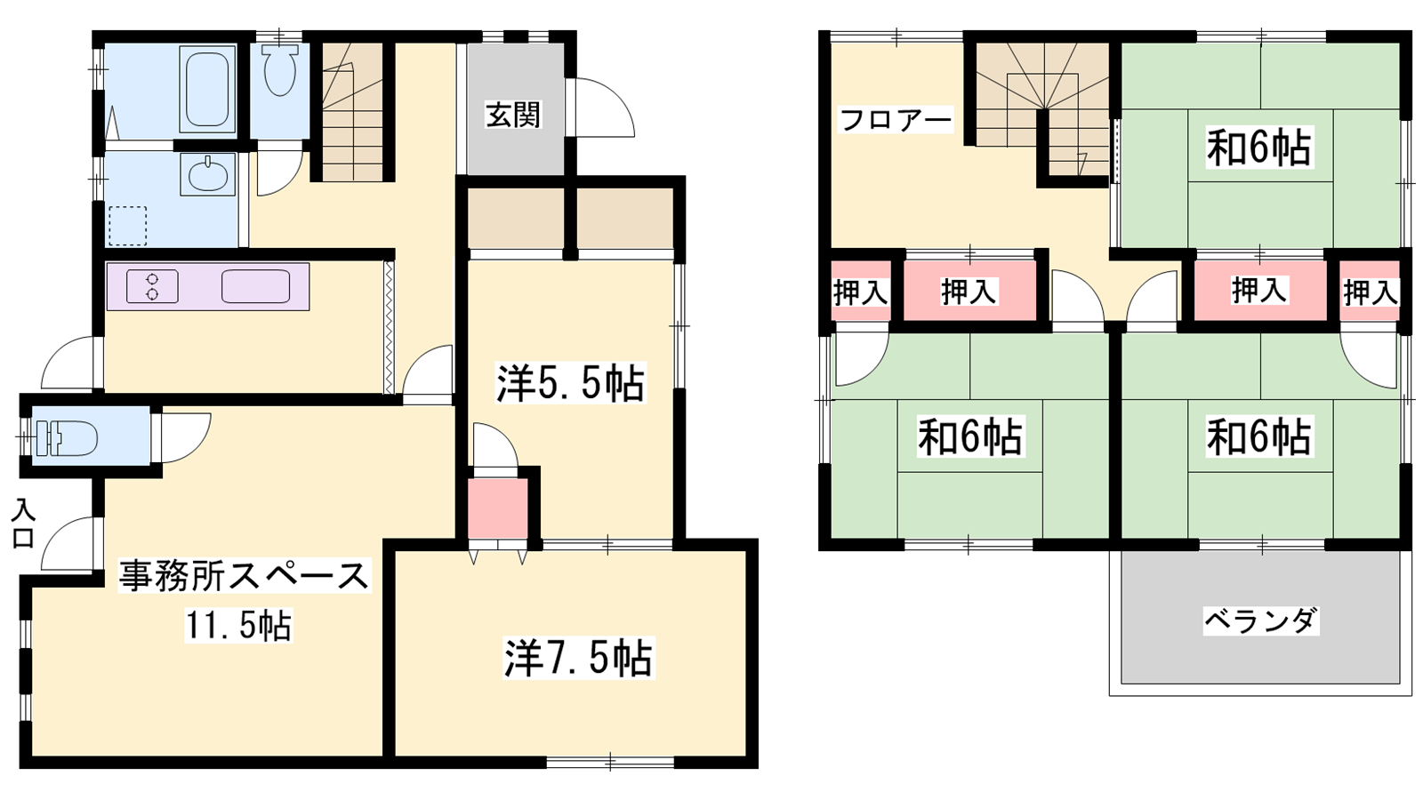 11.5帖の事務所スペース付き2階建て貸家です。軽自動車用駐車スペース1台付き。