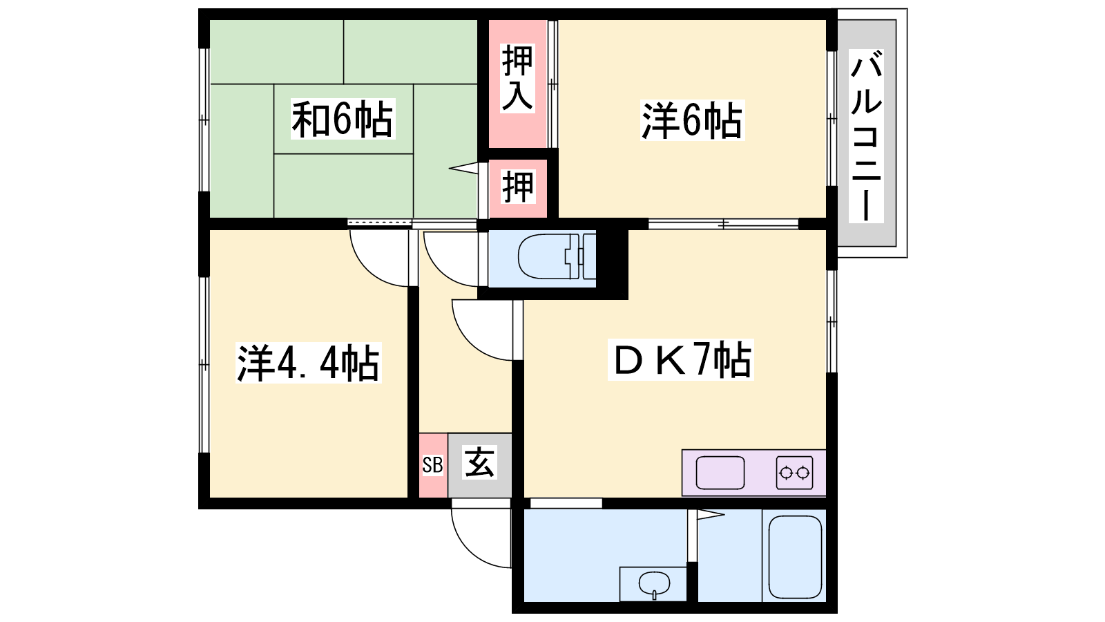 - DK7.2帖、洋室6帖、和室6帖、洋室4.4帖