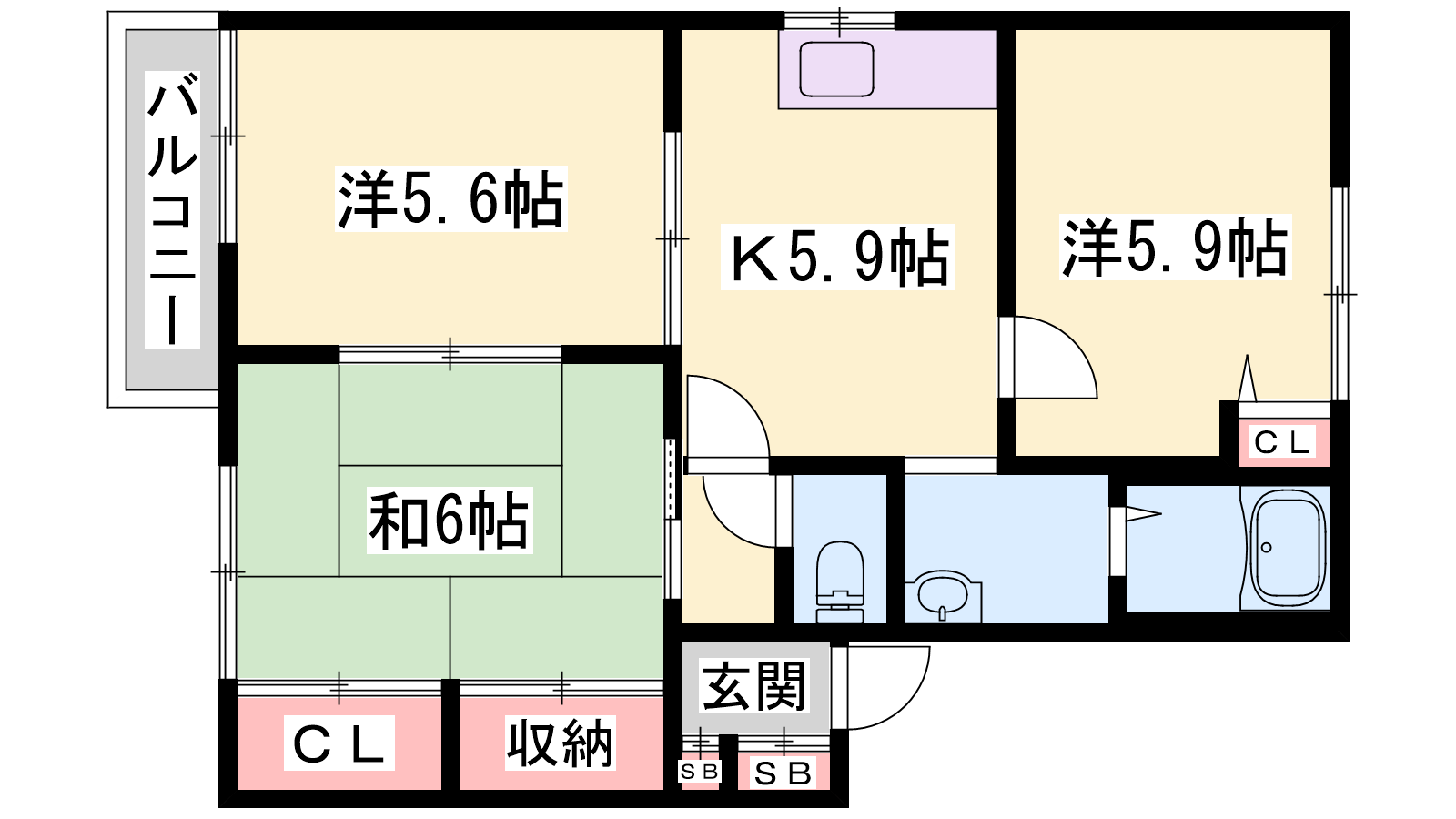 - K5.9帖、洋室5.9帖、洋室5.6帖、和室6帖
