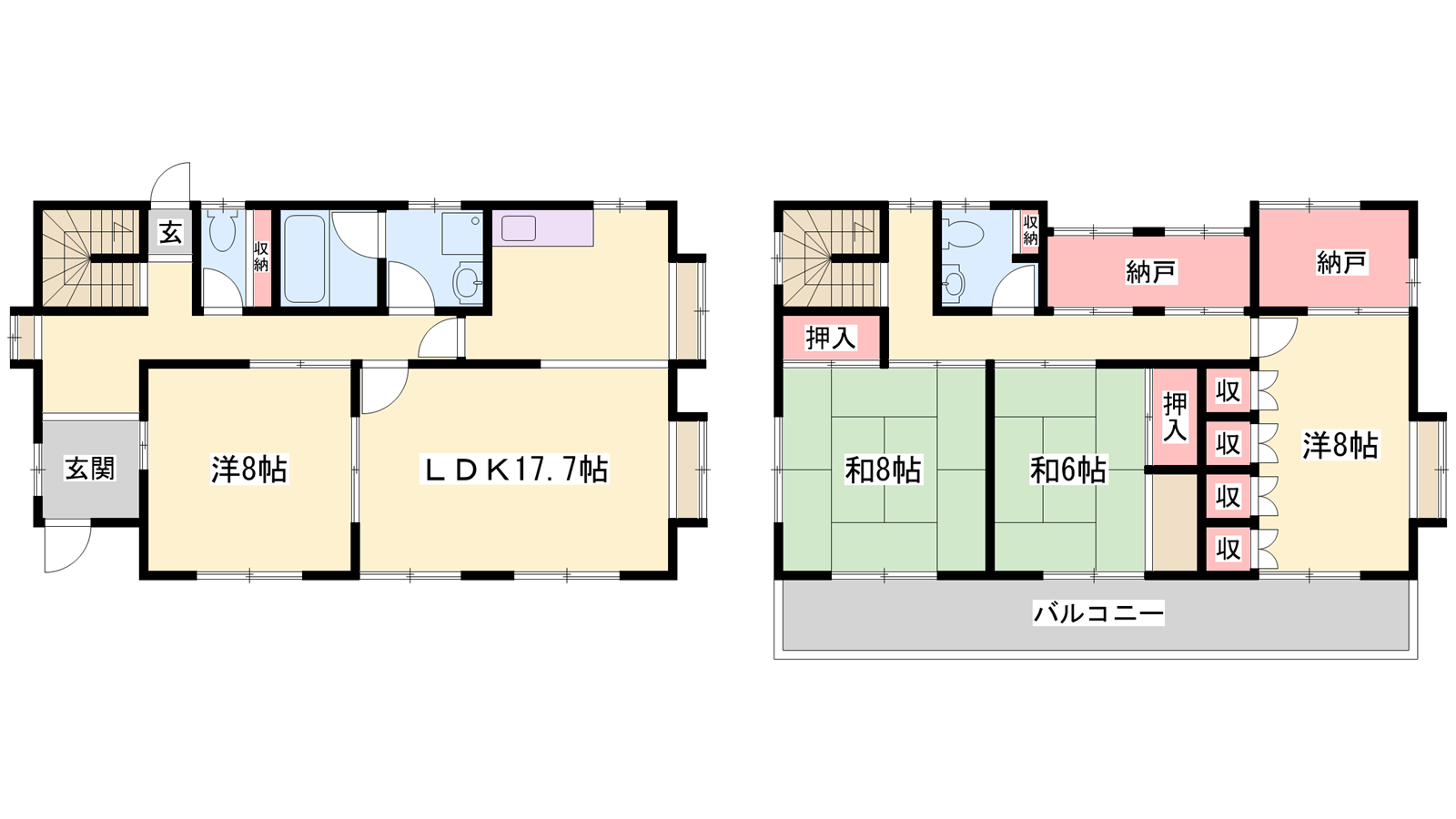 - LDK17.7帖、洋室8帖、洋室8帖、和室8帖、和室6帖