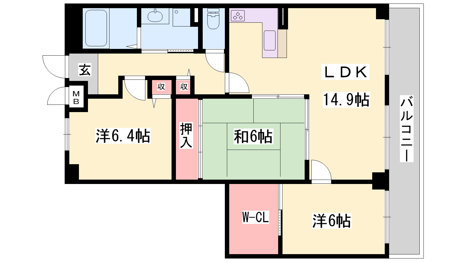 - LDK14.9帖、洋室6.4帖、洋室6帖、和室6帖