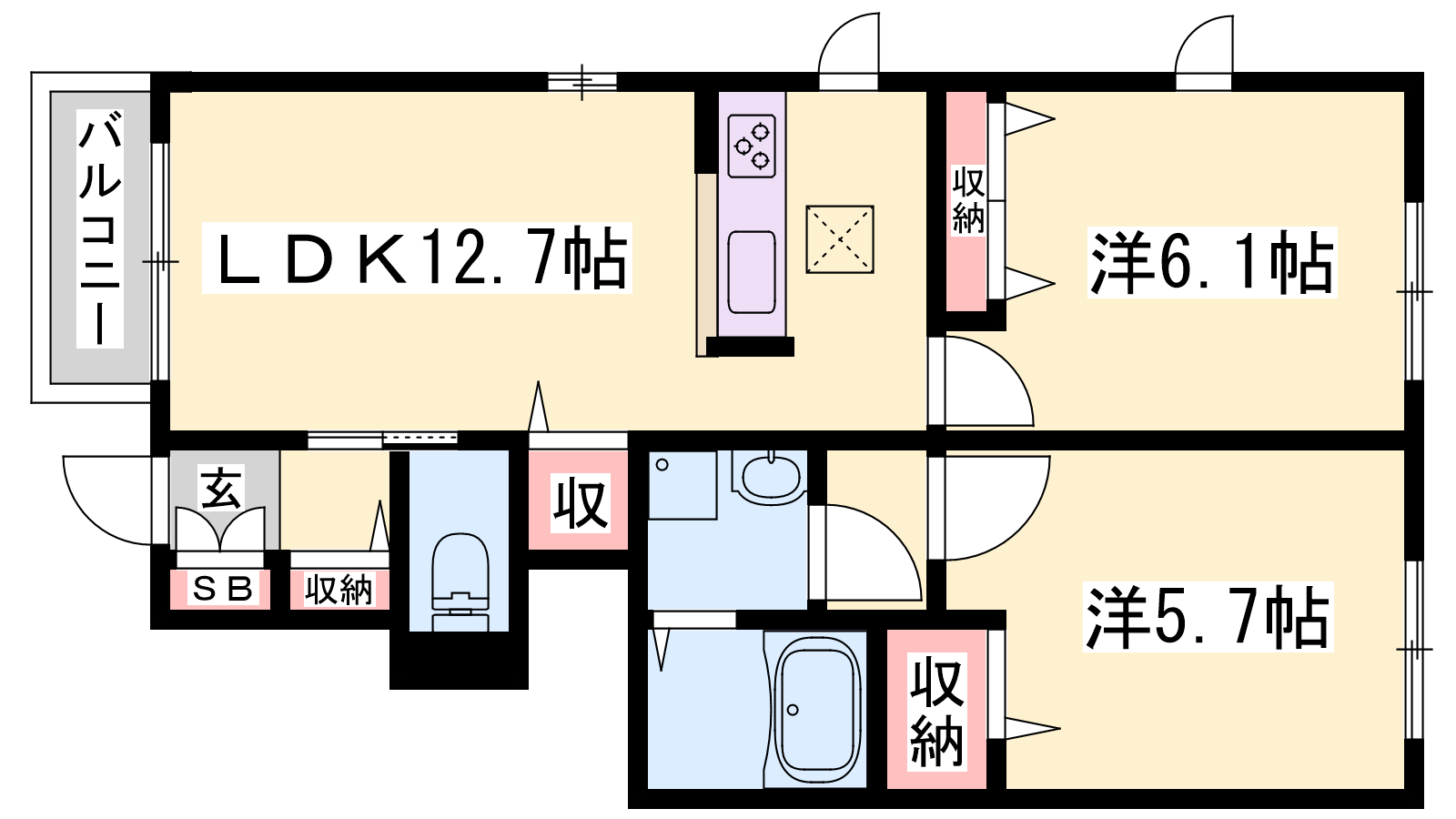 - LDK12.7帖、洋室6.1帖、洋室5.7帖