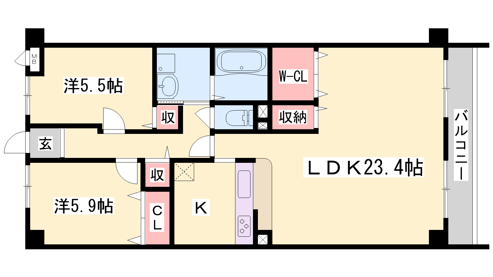 - LDK23.4帖、洋室5.9帖、洋室5.5帖