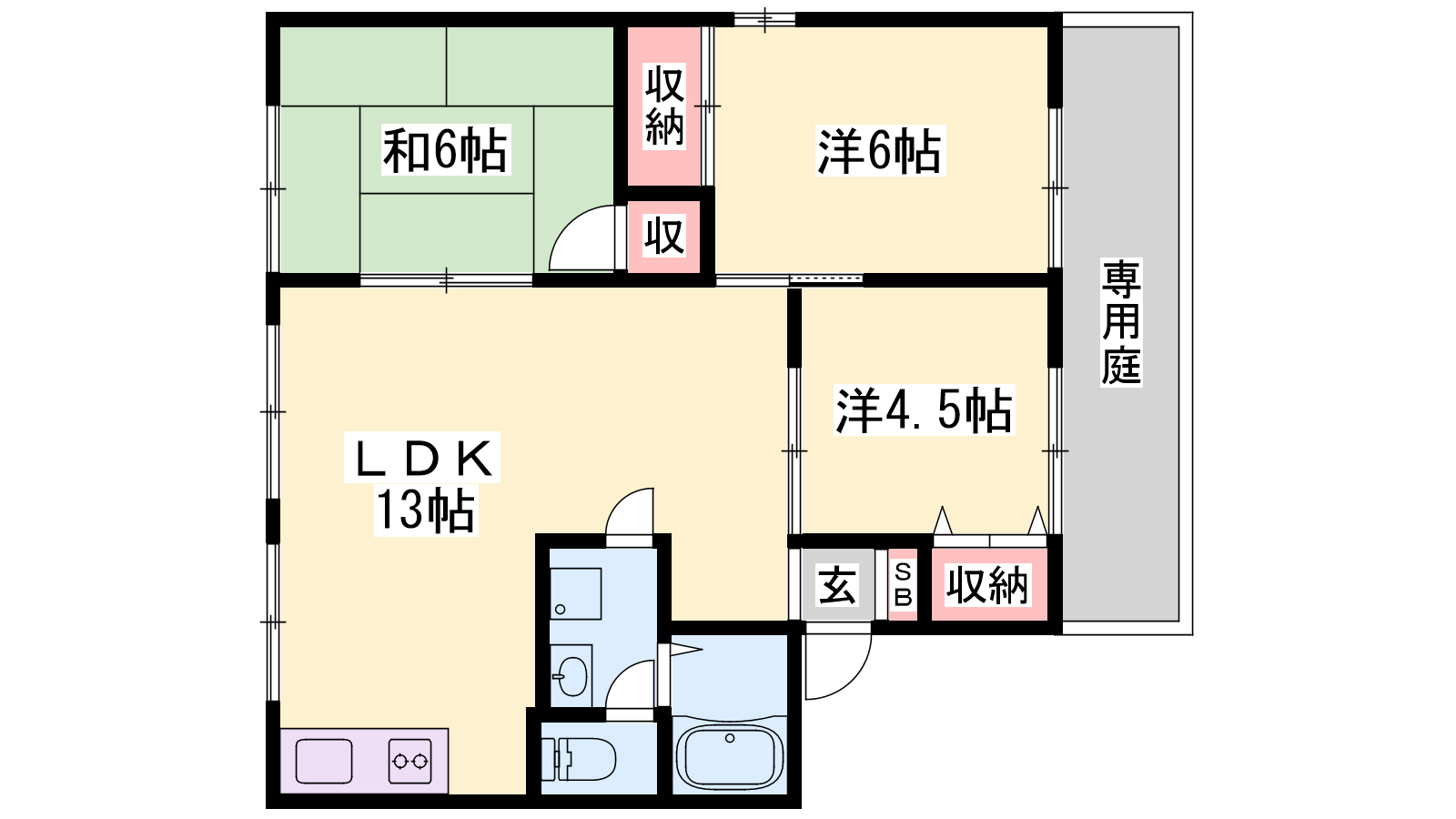 - LDK13帖、洋室6帖、洋室4.5帖、和室6帖