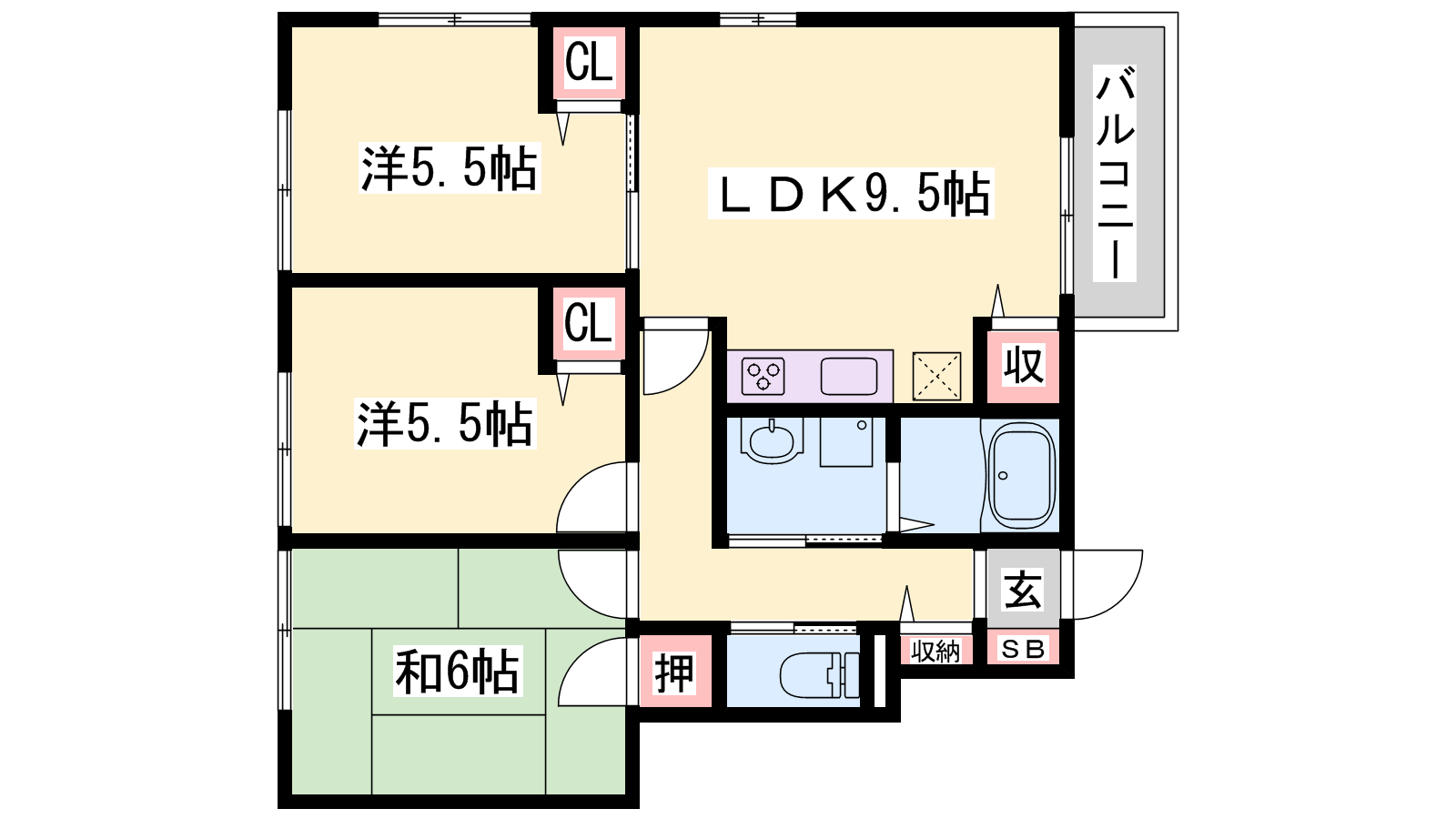 - LDK9.5帖、洋室5.5帖、洋室5.5帖、和室6帖