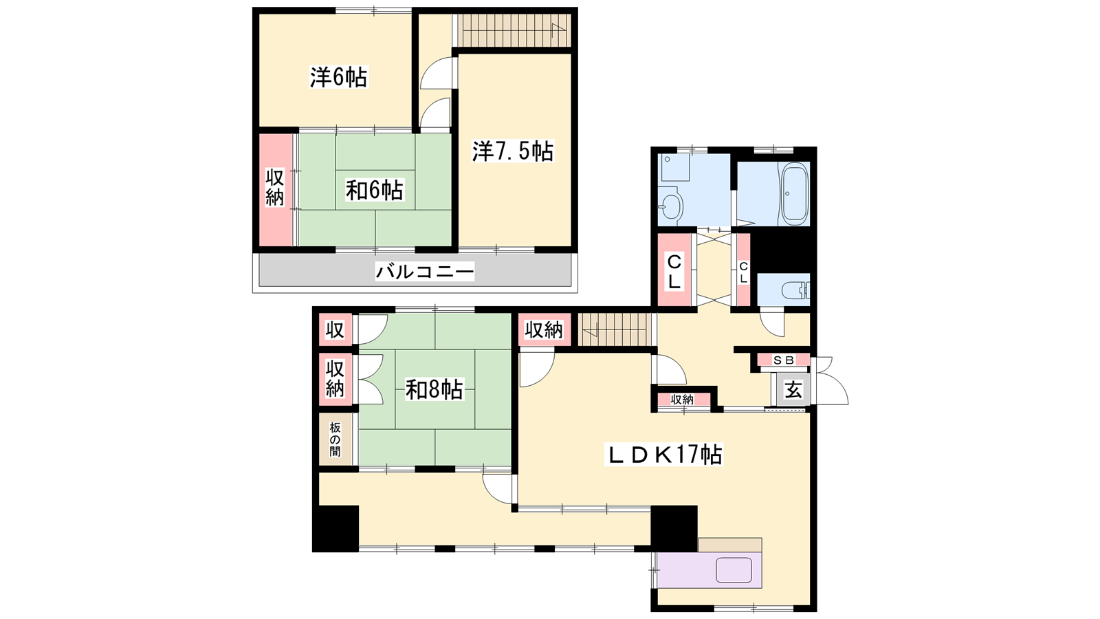 - LDK17帖、洋室7.5帖、洋室6帖、和室8帖、和室6帖