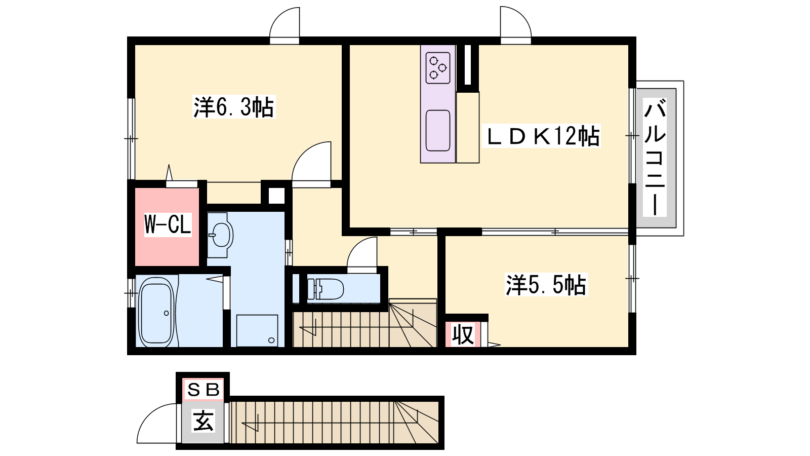 - LDK12帖、洋室6.3帖、洋室5.5帖