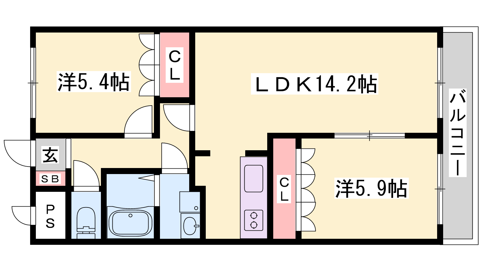 - LDK14.2帖、洋室5.9帖、洋室5.4帖