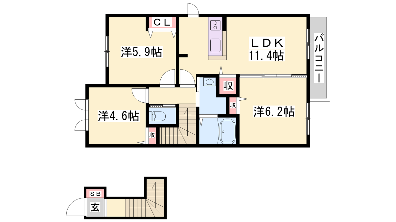 - LDK11.4帖、洋室6.2帖、洋室5.9帖、洋室4.6帖