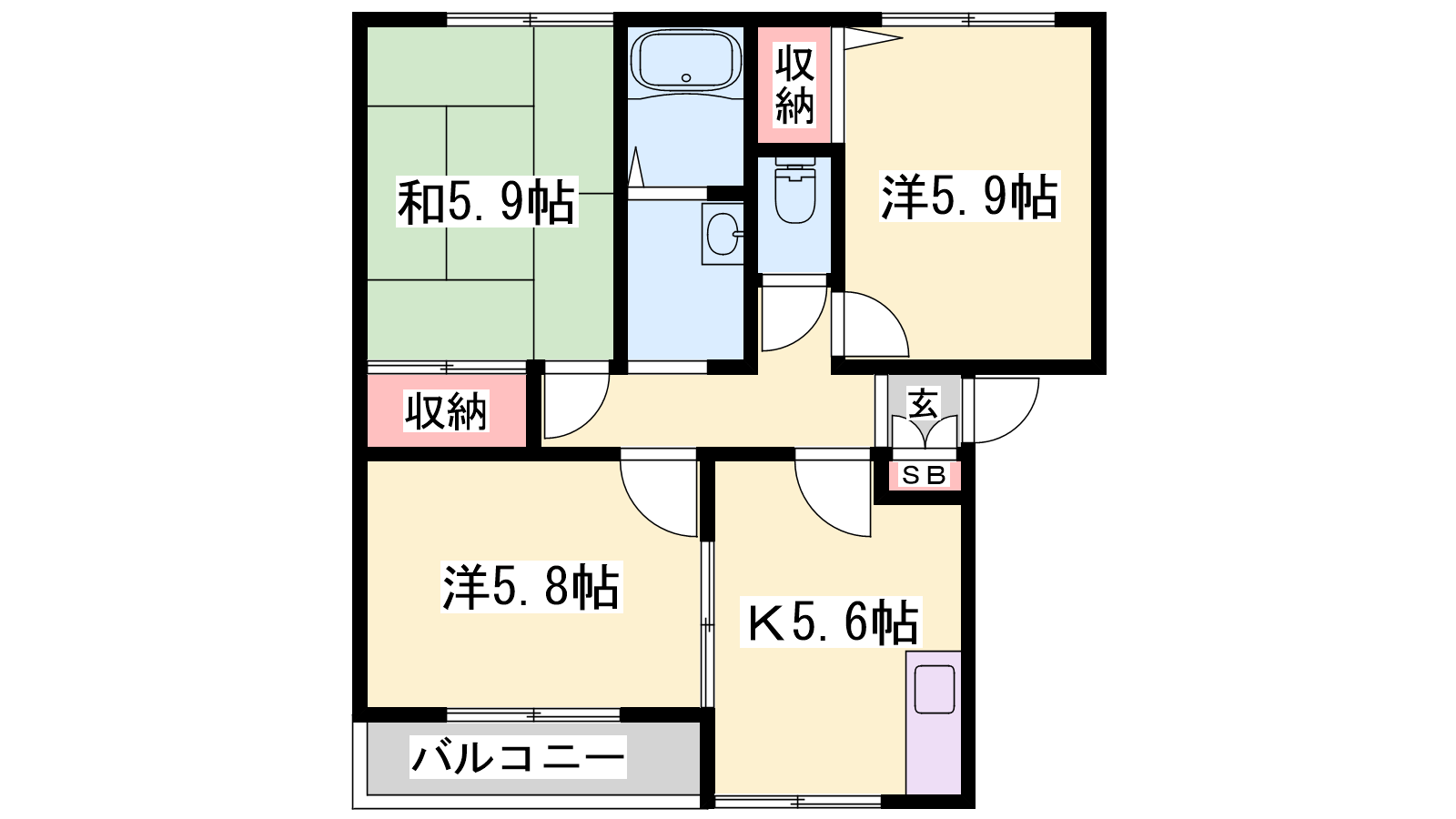- K5.6帖、洋室5.8帖、洋室5.9帖、和室5.9帖